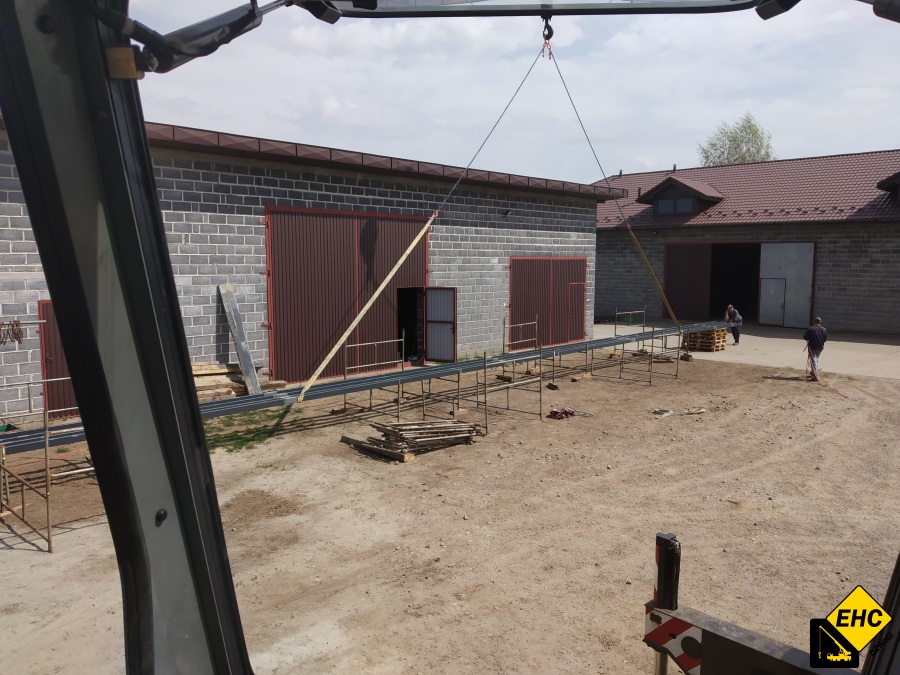 Docieramy na realizację w ustalonym terminie. Jak wyglądają nasze prace? Na miejscu zlecenia czekają na nas długie stalowe elementy konstrukcji dachowej. Za każdym razem są one podpinane pod zawiesia znajdujące się na haku. Jak się okazuje, stelaż dachu został już wcześniej zamontowany. Naszemu dźwigowi pozostaje tylko jego wypełnienie.
