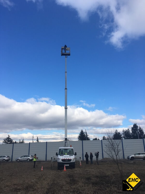 Prace miały miejsce w Zabierzowie koło Krakowa. Ekipa potrzebowała sfotografować obszar, na którym będzie podejmować działania w przyszłości. Przyjechałem więc podnośnikiem na miejsce prac. Wjechałem zwyżką „w teren”. Umiejętnie rozłożyłem podpory, odpowiednio je zabezpieczając. W międzyczasie Piotr z ekipy ubierał sprzęt ochrony indywidualnej i przygotowywał aparat fotograficzny.