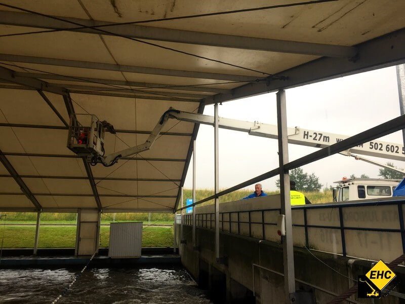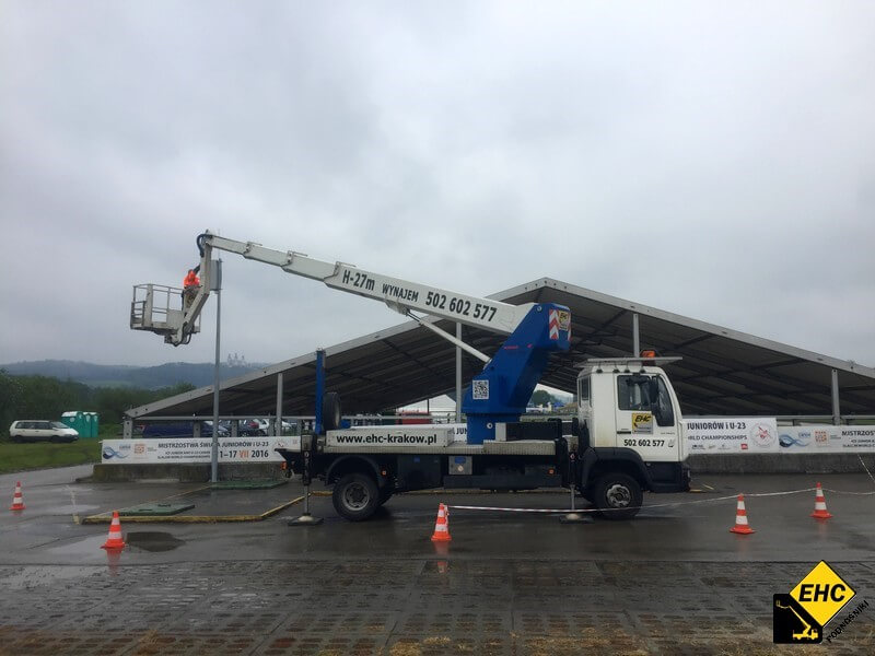 Nie było to jednak proste zadanie. Lokalizacja, do której ekipa potrzebowała się dostać, była trudno dostępna. Znajdowała się w głębi toru. Słysząc to od Klienta, już wiedzieliśmy, że będzie potrzebował podnośnika koszowego o większym wysięgu. Znając miejsce z poprzednich realizacji, doradziliśmy mu do tego zlecenia podnośnik koszowy H – 27. Nie tylko w związku z większym wysięgiem, ale także ze względu na jego łamane ramię.