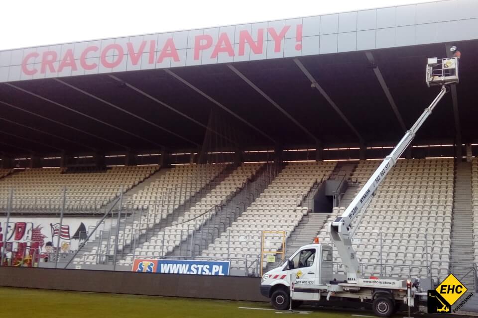 Nasze czwartkowe zlecenie odbywa się na stadionie Cracovii. Oświetleniowcy, przy użyciu zwyżki H-22 m, muszą wykonać serwis wszystkich lamp. Jest to istotne, ponieważ następnego dnia wieczorem ma odbyć się tam ważny mecz.