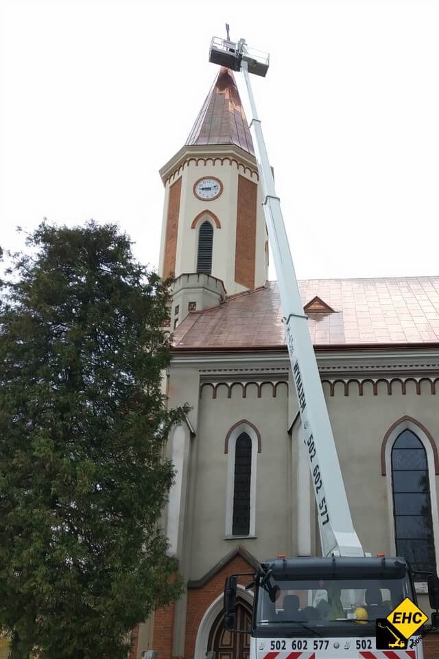 Czynności konserwacyjne zajmują im około 3 godzin. Klient wynajął podnośnik na 5. W związku z tym ekipa monterska postanawia sprawdzić przy okazji stan orynnowania kościoła.