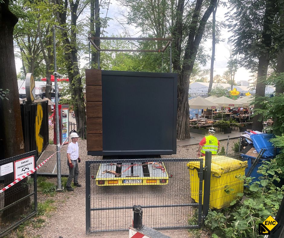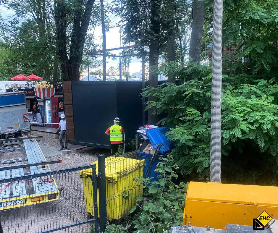 O 17:00 na miejscu zlecenia pojawia się operator Karol wraz z żurawiem samojezdnym. Gotowy kontener gastronomiczny już czeka na przeniesienie. Na początek trzeba ustalić, gdzie dokładnie ma stanąć. Gdy wszystko staje się wiadome, następuje rozłożenie dźwigu kołowego. Kolejno pod zawiesia na haku podpinany jest trawers. Całość zostaje przesunięta na wysokości nad kontener gastronomiczny.